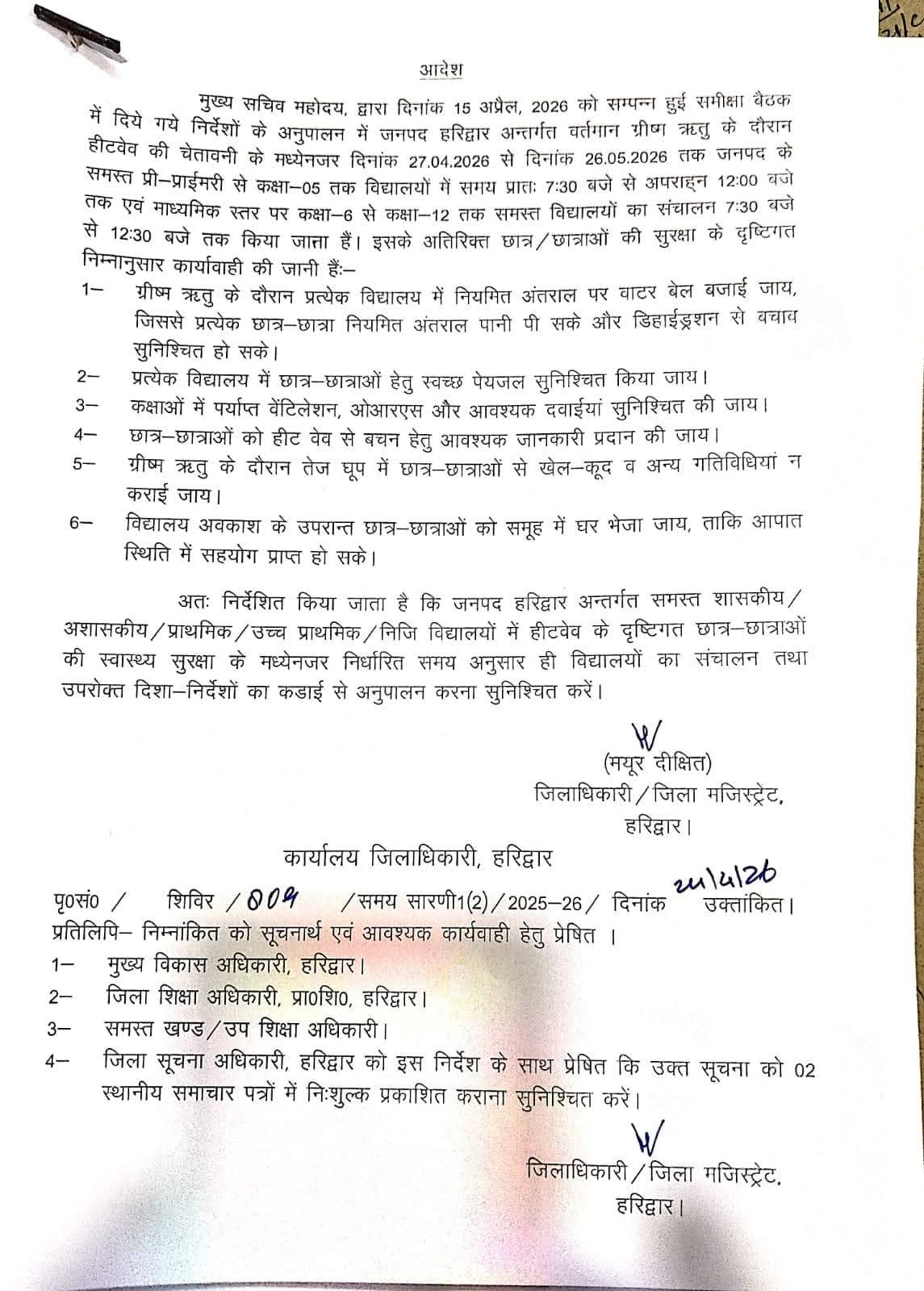 हरिद्वार। शासन के निर्देशों के क्रम जिलाधिकारी मयूर दीक्षित ने जनपद हरिद्वार में हीटवेव से बच्चों की सुरक्षा के लिए 27 अप्रैल 2026 से 26 मई 2026 तक विद्यालयों के समय में परिवर्तन किया गया है। उन्होंने प्री-प्राइमरी से कक्षा 5 तक विद्यालय का समय प्रातः 7:30 बजे से 12:00 बजे तक तथा कक्षा 6 से 12 तक के छात्र-छात्राओं 7:30 बजे से 12:30 बजे तक कक्षाएं संचालित होंगे।